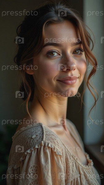 Большой портрет молодой улыбающейся красивой женщины, женский образ. Генеративный искусственный интеллект