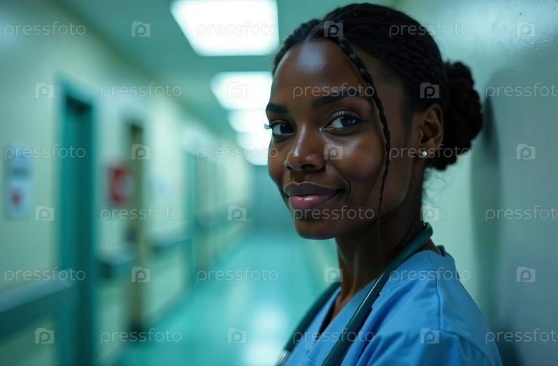 Портрет женщины-врача Фон коридора в больнице. Сгенерировано ИИ