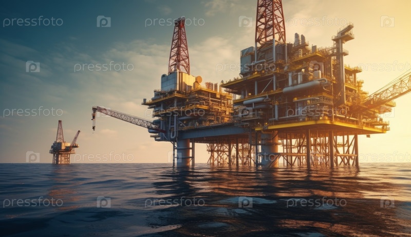 Высокая нефтяная вышка возвышается посреди океана на закате, ее металлическая конструкция контрастирует с текущими цветами неба и воды, создавая завораживающий природный пейзаж