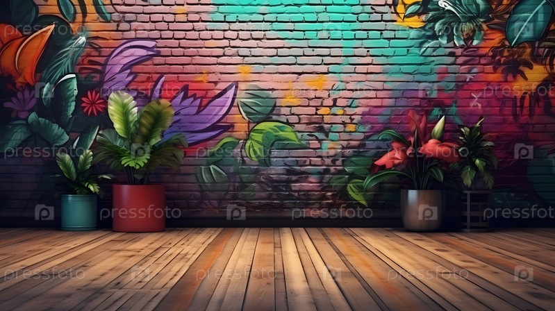 Цветы в горшке на фоне красочного граффити на стене