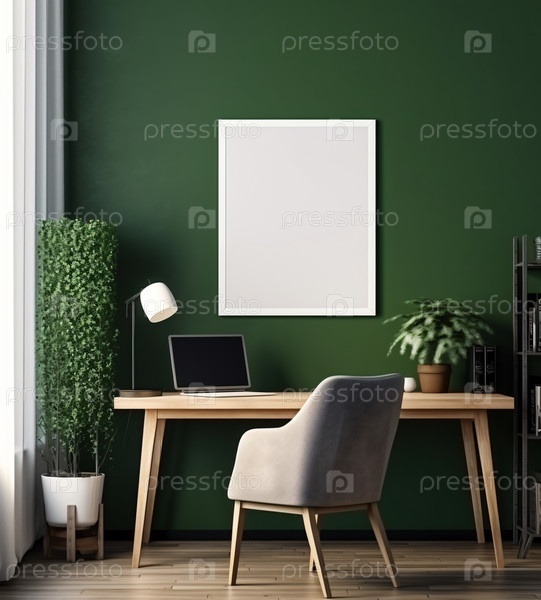 Минималистичный и комфортный интерьер домашнего рабочего пространства с деревянной мебелью, местом для копирования для монтажа на деревянном столе и пустой рамкой на белой стене
