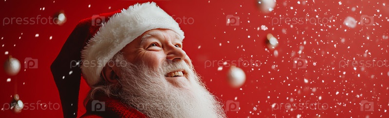 Санта в красном стоит на заснеженном фоне, держа в руках веселые праздничные игрушки
