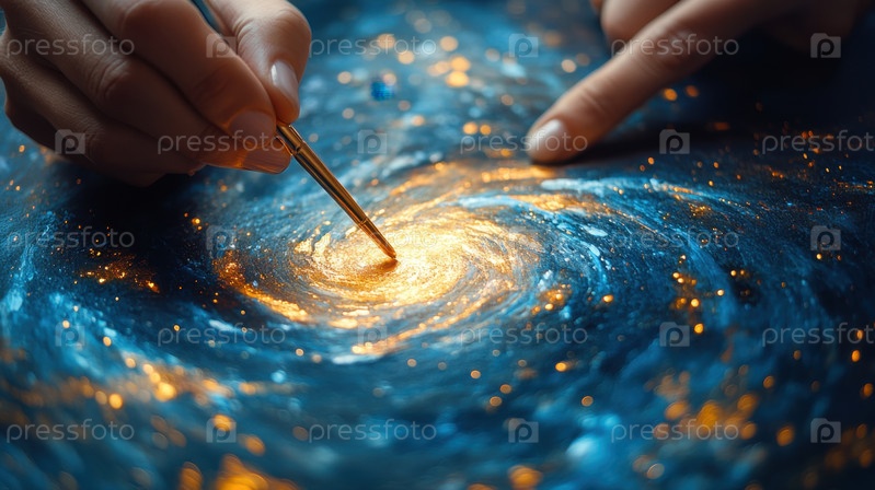 Создание космических чудес: руки создают золотую иллюстрацию галактики