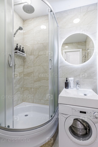 Современная ванная комната с угловой душевой кабиной, стиральной машиной и стильным интерьером с мраморной плиткой и рассеянным освещением