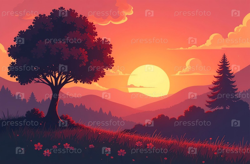Лесной пейзаж, лиственные и еловые деревья, фон заката. Генеративный ИИ