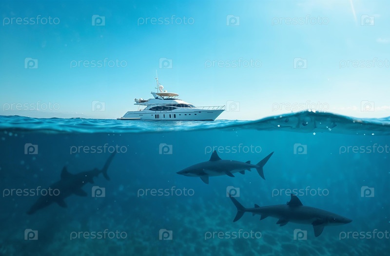 Корабль яхта на поверхности океанской воды, морская акула плавает под водой. Генеративный искусственный интеллект