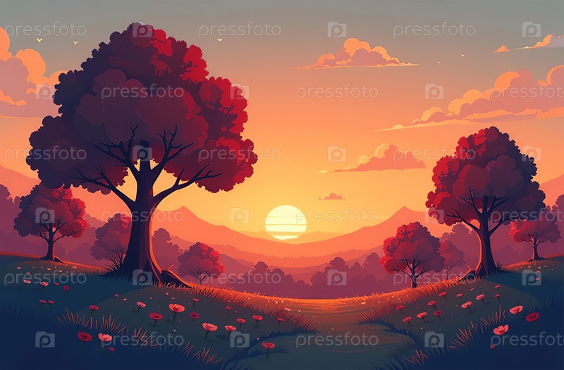 Лесной пейзаж, лиственные и еловые деревья, фон заката. Генеративный ИИ