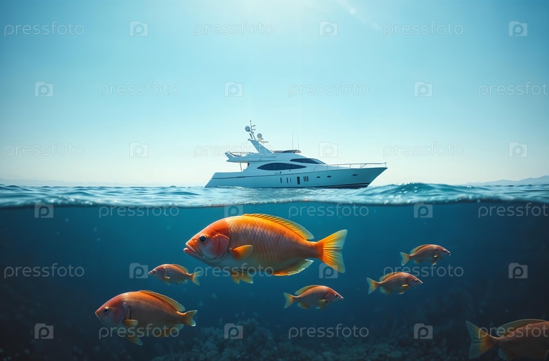 Корабль яхта на поверхности океанской воды, морские рыбы плавают под водой. Генеративный искусственный интеллект