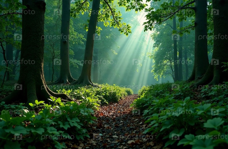 Лесной пейзаж, лиственные и еловые деревья, солнечный фон. Генеративный ИИ