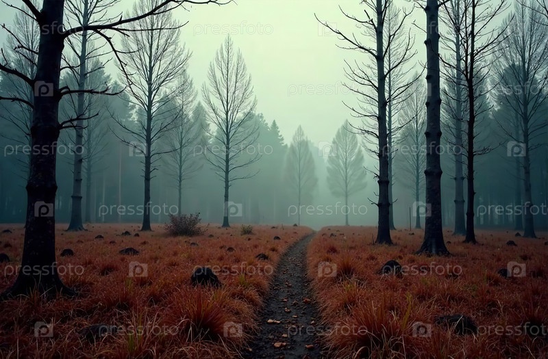 Лесной пейзаж, лиственные и еловые деревья, туманный фон. Генеративный ИИ