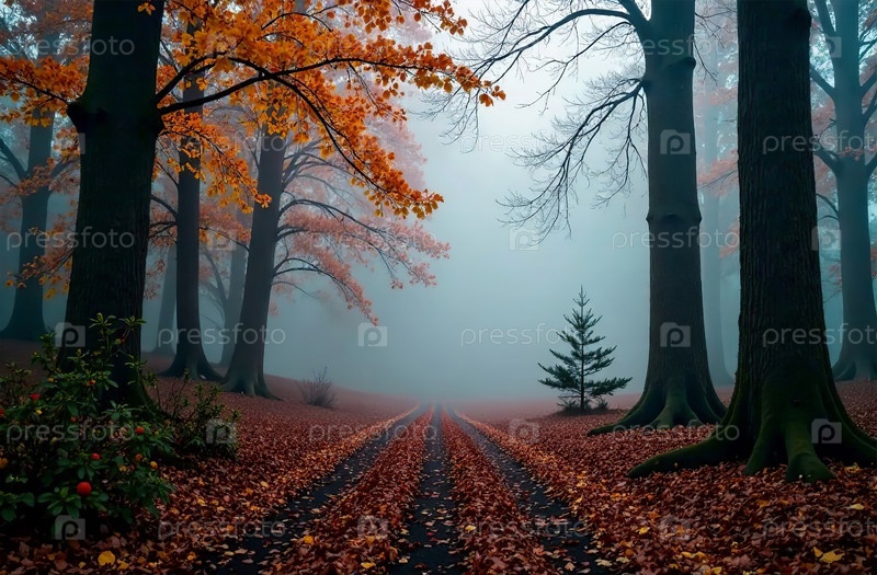Лесной пейзаж, лиственные и еловые деревья, туманный фон. Генеративный ИИ