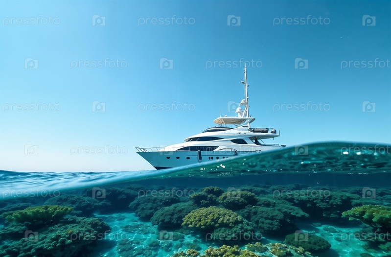 Корабль яхта на поверхности океанской воды, морские кораллы под водой. Генеративный искусственный интеллект
