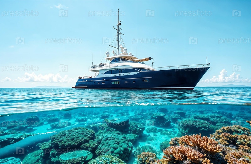 Корабль яхта на поверхности океанской воды, морские кораллы под водой. Генеративный искусственный интеллект