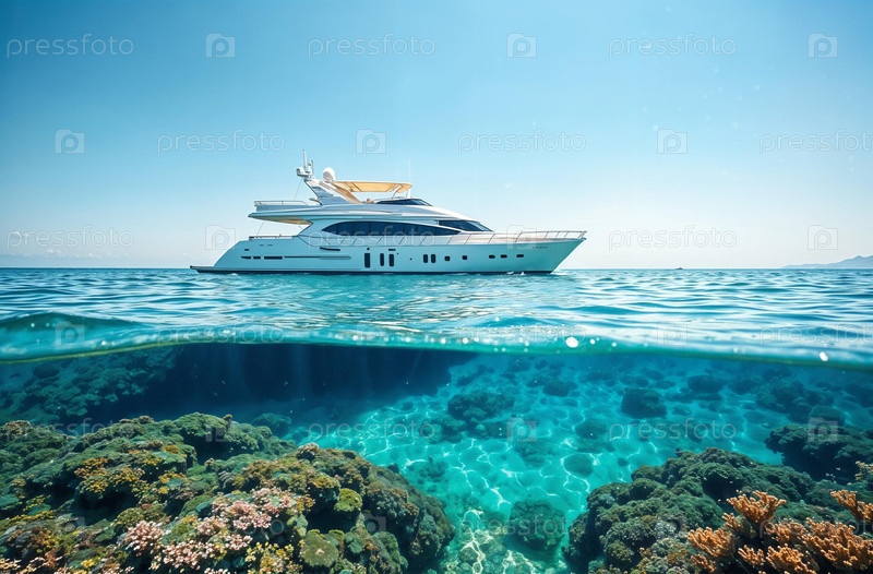 Корабль яхта на поверхности океанской воды, морские кораллы под водой. Генеративный искусственный интеллект