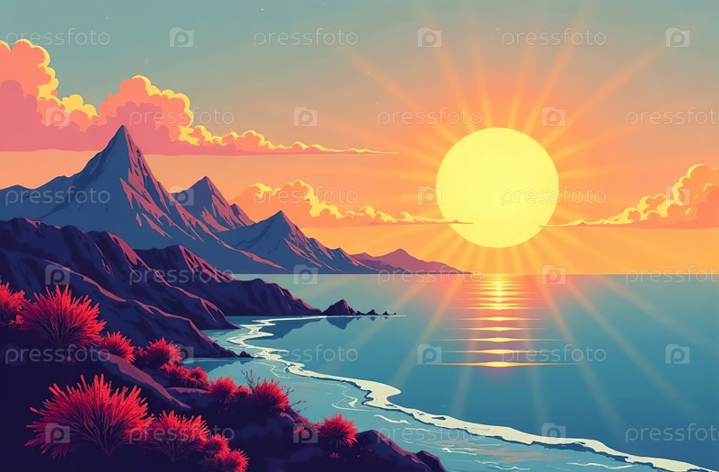 Горный пейзаж, лучи закатного солнца на заднем плане, природа восхода солнца. Генеративный искусственный интеллект