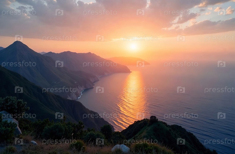 Горный пейзаж, лучи закатного солнца на заднем плане, природа восхода солнца. Генеративный искусственный интеллект