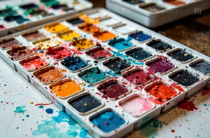 Акварельная краска на рабочем столе художника, художественный инструмент для хобби рисования. Генеративный ИИ