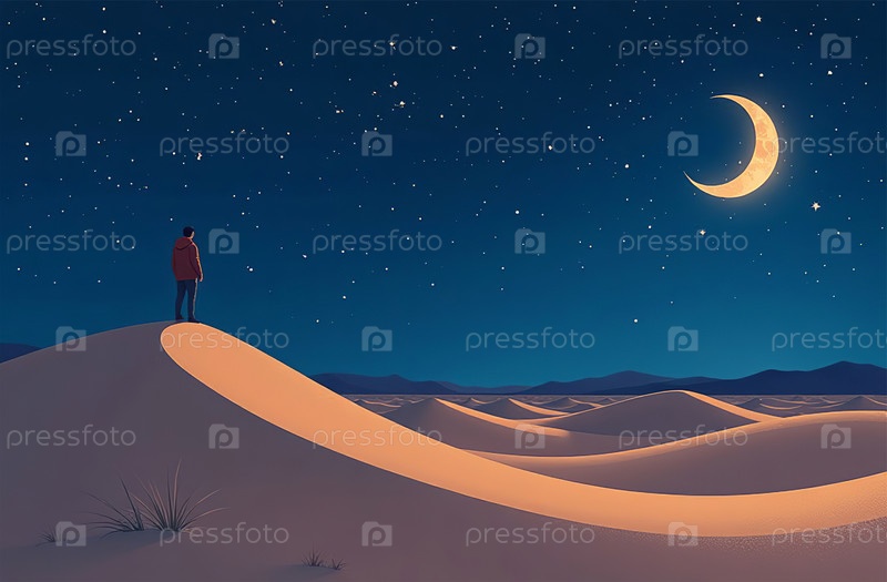 Песчаные дюны в лунном свете, пустынные красные холмы в ночном небе. Генеративный ИИ