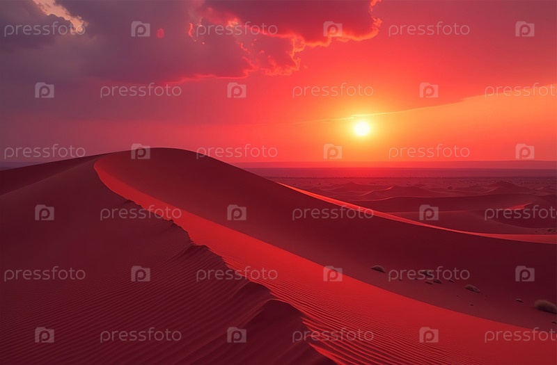 Песчаные дюны в солнечном свете, пустынные красные холмы пустыни на закатном небе. Генеративный искусственный интеллект