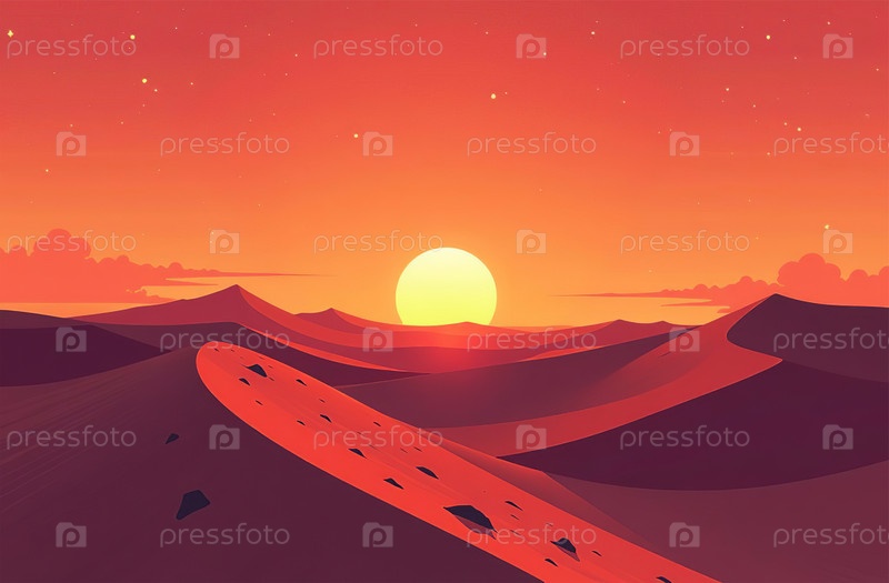 Песчаные дюны в солнечном свете, пустынные красные холмы пустыни на закатном небе. Генеративный искусственный интеллект