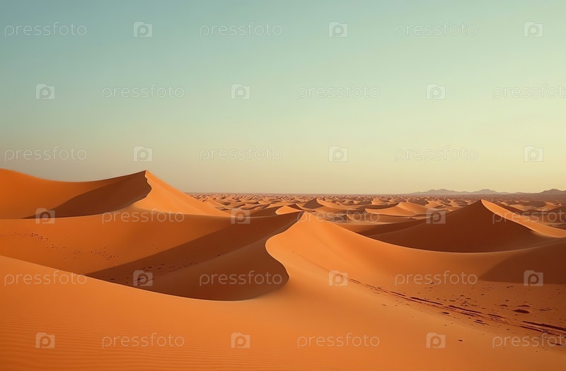 Песчаные дюны в солнечном свете, пустынные красные холмы пустыни на закатном небе. Генеративный искусственный интеллект