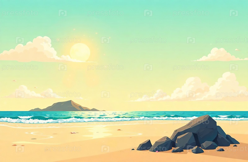 Голубая океанская волна, белая морская пена, морской пейзаж, пустынный песчаный пляж. Генеративный ИИ