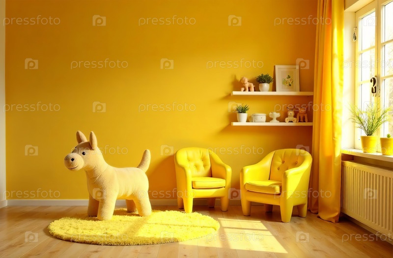 Современный интерьер детской комнаты желтого цвета, игровая комната в доме. Генеративный искусственный интеллект