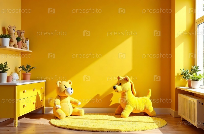 Современный интерьер детской комнаты желтого цвета, игровая комната в доме. Генеративный искусственный интеллект
