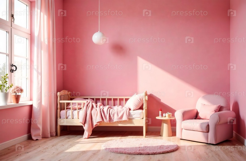 Современный интерьер детской комнаты розового цвета, игровая комната в доме. Генеративный искусственный интеллект