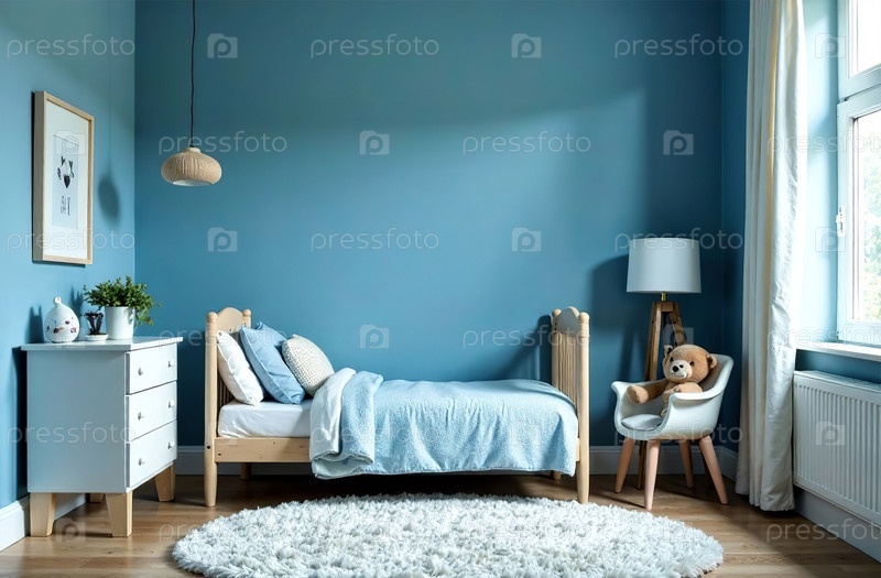 Современный интерьер детской комнаты синего цвета, игровая комната в доме. Генеративный искусственный интеллект