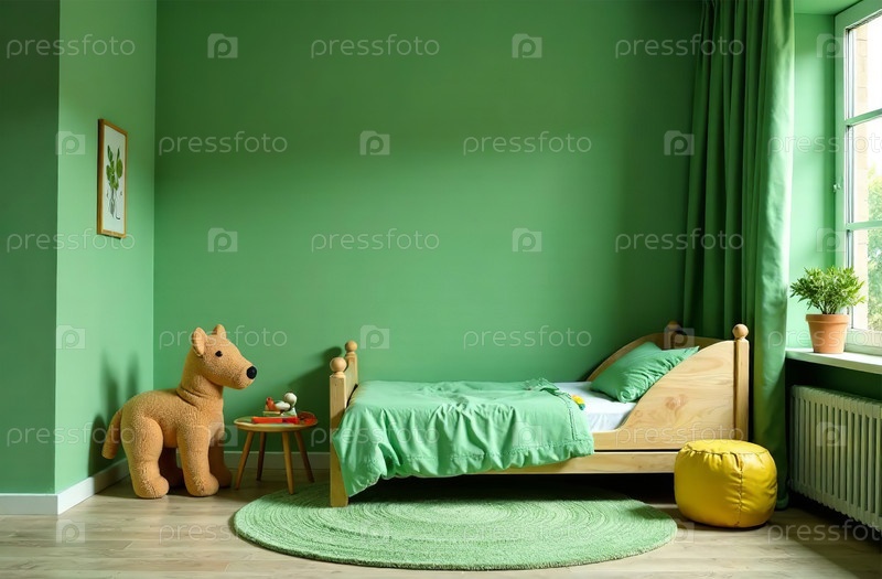 Современный интерьер детской комнаты зеленого цвета, игровая комната в доме. Генеративный искусственный интеллект