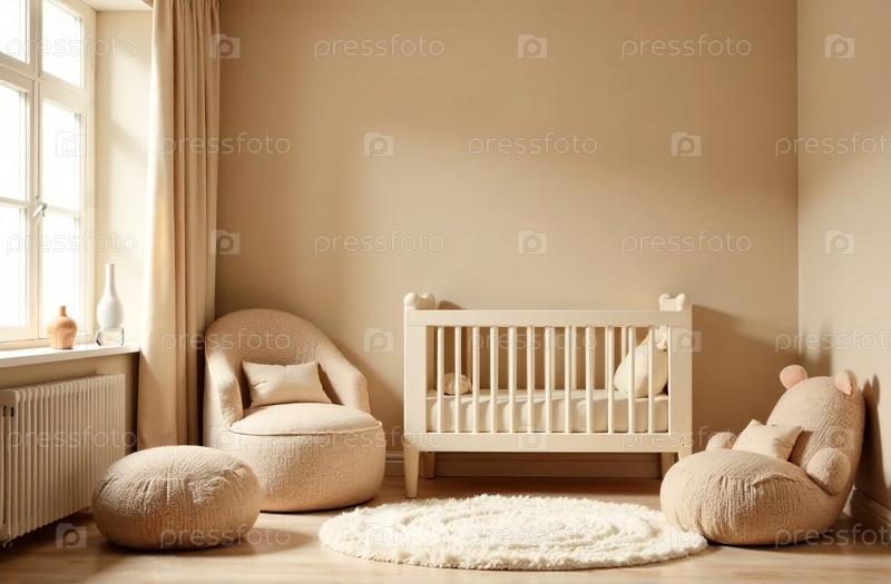 Современный интерьер детской комнаты бежевого цвета, игровая комната в доме. Генеративный искусственный интеллект