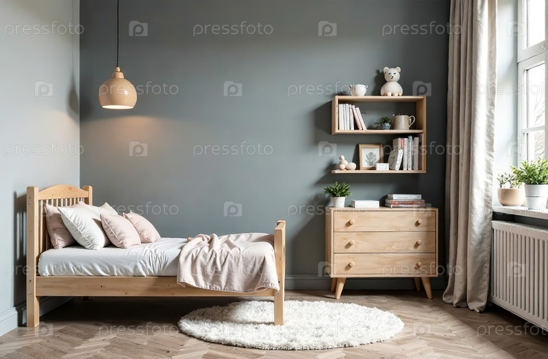 Современный интерьер детской комнаты серого цвета, игровая комната в доме. Генеративный искусственный интеллект