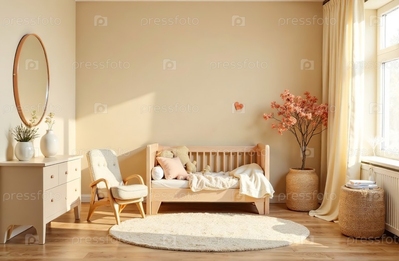 Современный интерьер детской комнаты бежевого цвета, игровая комната в доме. Генеративный искусственный интеллект