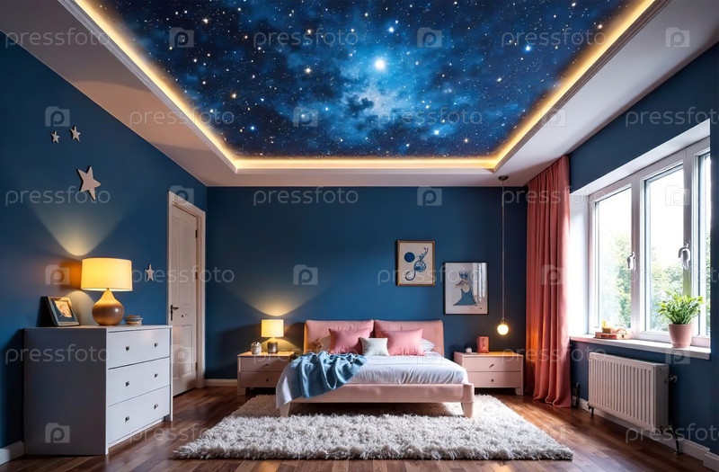 Современный интерьер детской комнаты, звездное небо, потолок, игровая комната, домик. Генеративный искусственный интеллект