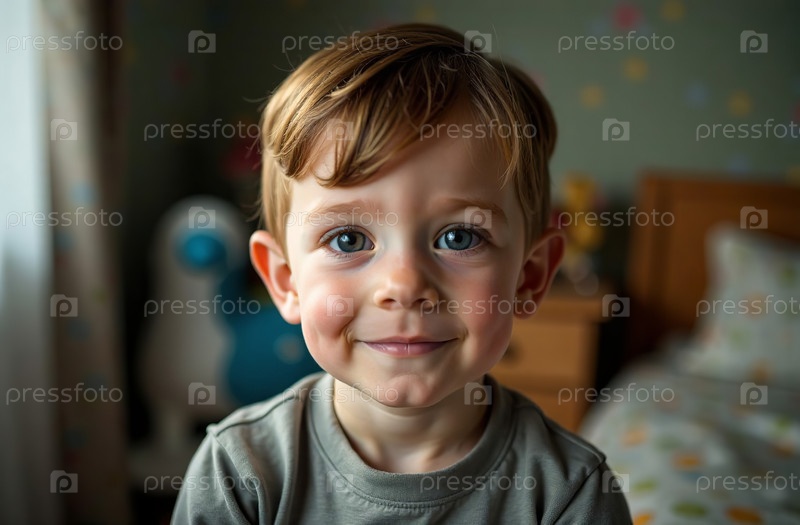 Портрет маленького мальчика в детской комнате, счастливое детство. Генеративный искусственный интеллект