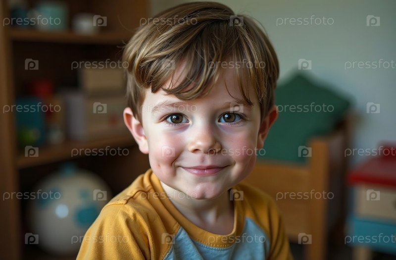 Портрет маленького мальчика в детской комнате, счастливое детство. Генеративный искусственный интеллект