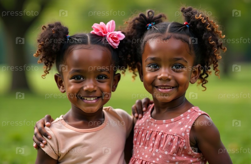 Портрет двух маленьких девочек, гуляющих в парке, счастливое детство. Генеративный искусственный интеллект