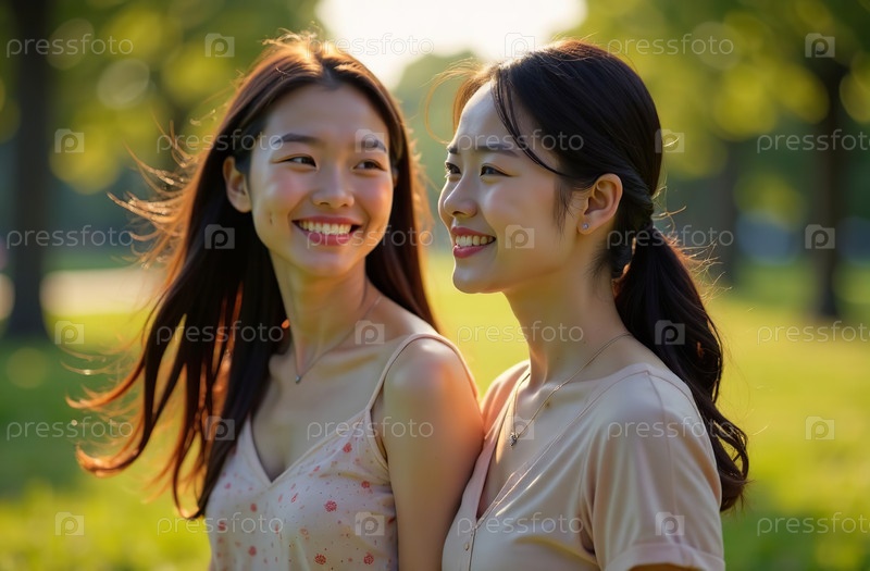 Большой портрет молодых улыбающихся красивых двух женщин, азиатка. Генеративный искусственный интеллект