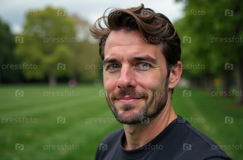 Привлекательный молодой человек стоит в летнем парке, портрет крупным планом. Генеративный искусственный интеллект