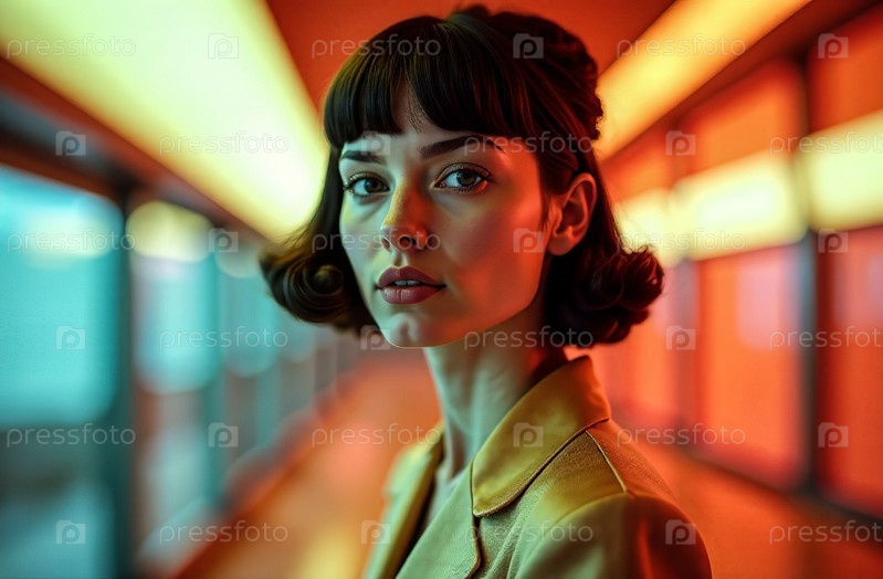 Большой ретро неоновый портрет 80-х годов красивой женщины, женский образ. Генеративный искусственный интеллект