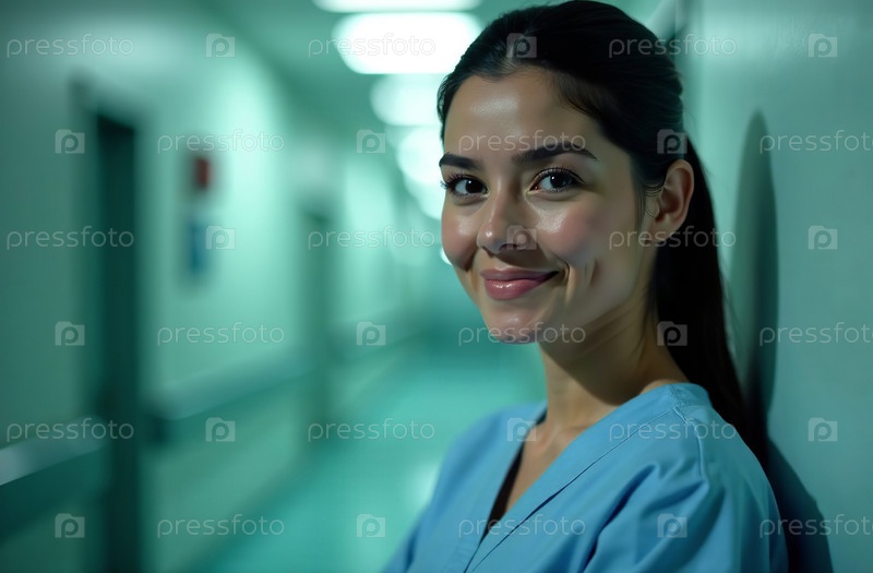 Портрет женщины-врача Фон коридора в больнице. Сгенерировано ИИ