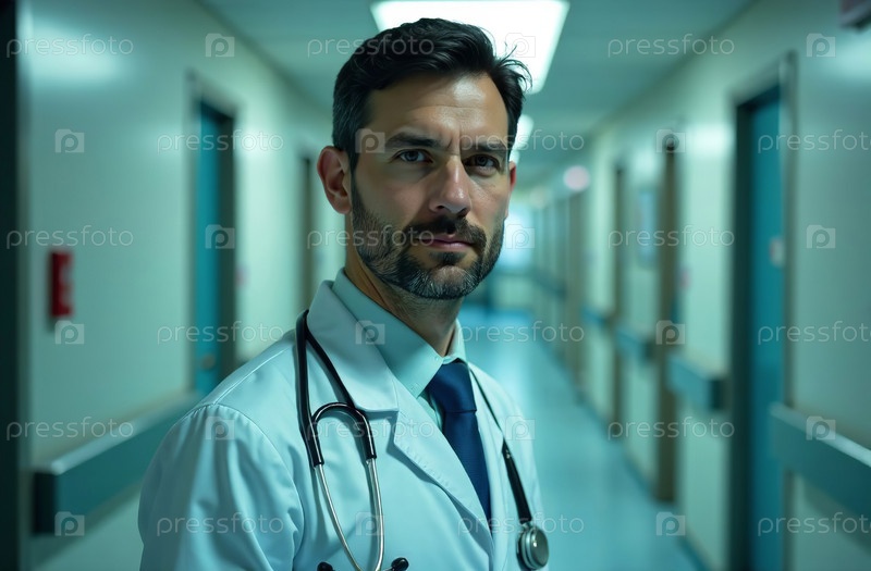 Портрет мужчины-врача Фон коридора в больнице. Сгенерировано искусственным интеллектом