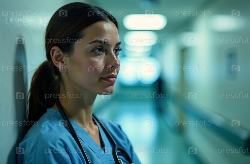 Портрет женщины-врача Фон коридора в больнице. Сгенерировано ИИ