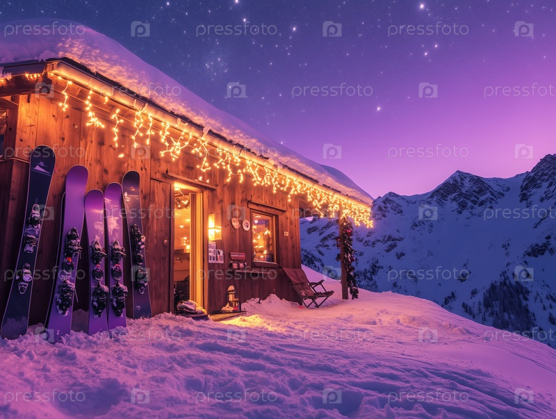 Уютный горный домик с лыжами и праздничными огнями под звездным небом