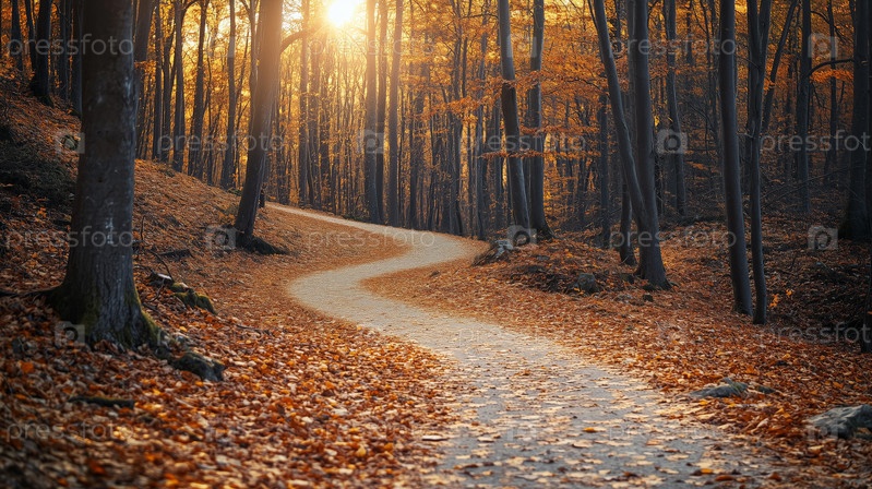 Извилистая лесная тропа, покрытая осенними листьями на рассвете