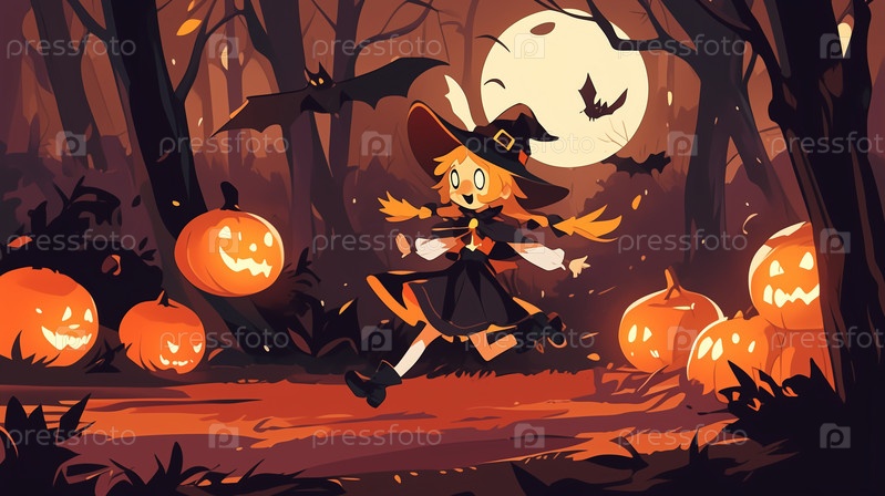 Милая ведьма бежит по тыквенному лесу в ночь Хэллоуина