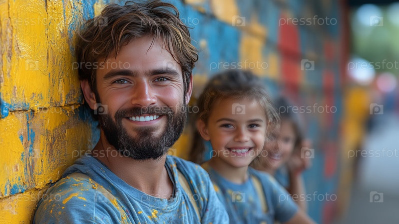 Улыбающиеся отец и дочери на фоне красочной расписной стены