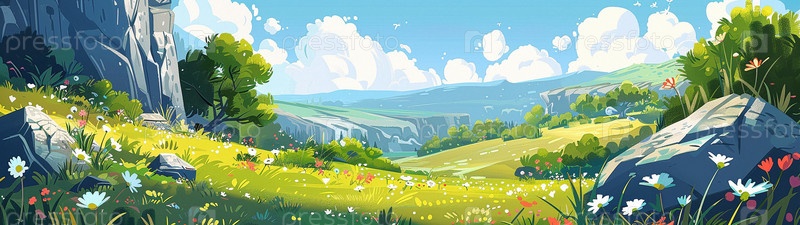 Летняя долина с цветами и деревьями. Панорамный рисунок