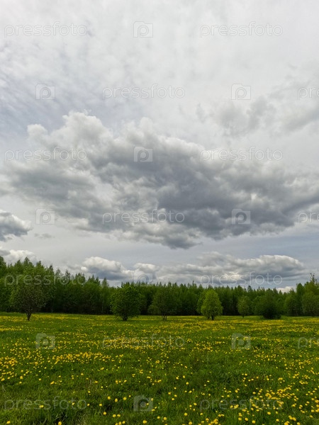 Красивый зеленый летний луг с цветами мать-и-мачехи и деревьями. Свежесть, прохлада, тень под голубым небом